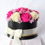 Acest aranjament este o declarație de stil și rafinament, îmbinând un design modern, tip hatbox, cu o compoziție florală de lungă durată (trandafiri de săpun/satin/silicon). Este o piesă centrală care impresionează prin lux și atenția la detalii.